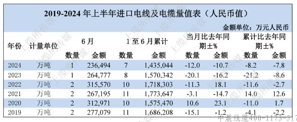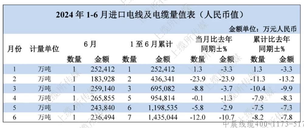 進(jìn)口方面,2024年6月我國電線電纜共進(jìn)口1萬噸,同比下降12.0%;進(jìn)口金額為23.6億元,同比下降10.7%。2024年1-6月我國電線電纜累計(jì)共進(jìn)口7萬噸,累計(jì)同比下降8.2%;進(jìn)口金額為143.5億元,累計(jì)同比下降7.8%。